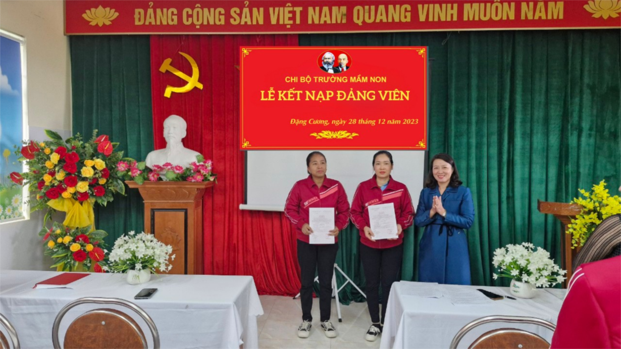 Bồi dưỡng, kết nạp đảng viên mới là nhiệm vụ thường xuyên được Chi bộ Trường mầm non Đặng Cương rất quan tâm. Việc giáo viên, nhân viên được kết nạp vào Đảng đã khẳng định sự cố gắng trong học tập, tu dưỡng, rèn luyện của các đồng chí. Căn cứ Điều lệ Đảng cộng sản Việt Nam và Hướng dẫn số: 01 - HD/TW ngày 28/9/2021 của Ban chấp hành Trung ương về hướng dẫn một số vấn đề cụ thể thi hành Điều lệ Đảng. Thực hiện Quyết định số: 1303-QĐ/HU ngày 05/12/2023, và Quyết định số: 1304-QĐ/HU ngày 05/12/2023 của Huyện uỷ An Dương về kết nạp đảng viên. Ngày 28/12/2023 Chi bộ Trường mầm non Đặng Cương long trọng tổ chức Lễ kết nạp đảng viên đối với 2 quần chúng: Nguyễn Thị Hạnh và Đỗ Thị Huyền.