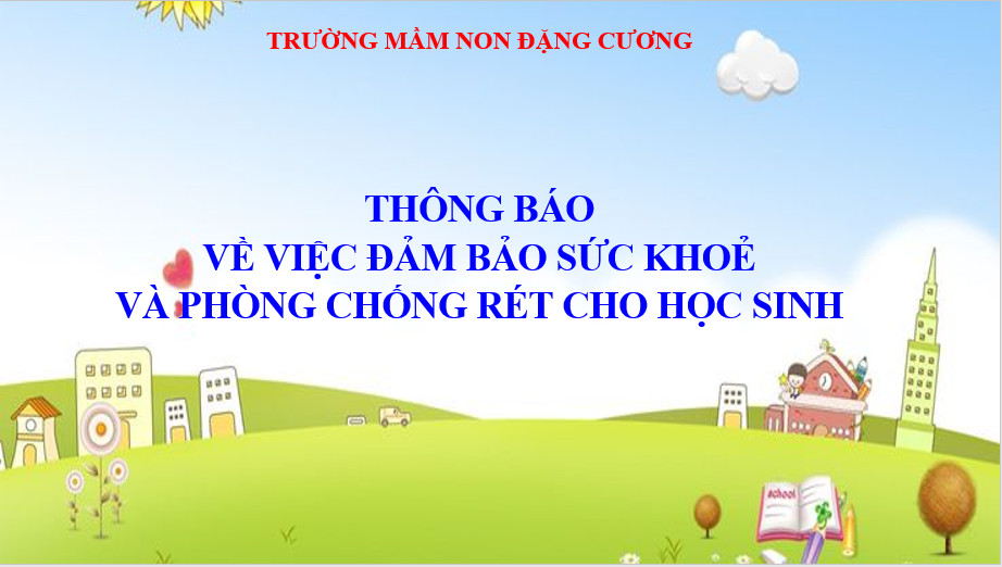 Các bậc phụ huynh lưu ý: Hiện nay khu vực Bắc Bộ đang đón một đợt không khí lạnh mạnh và được đánh giá là mạnh nhất mùa đông năm nay. Ban giám hiệu Trường Mầm non Đặng Cương thông báo một số nội dung sau:
