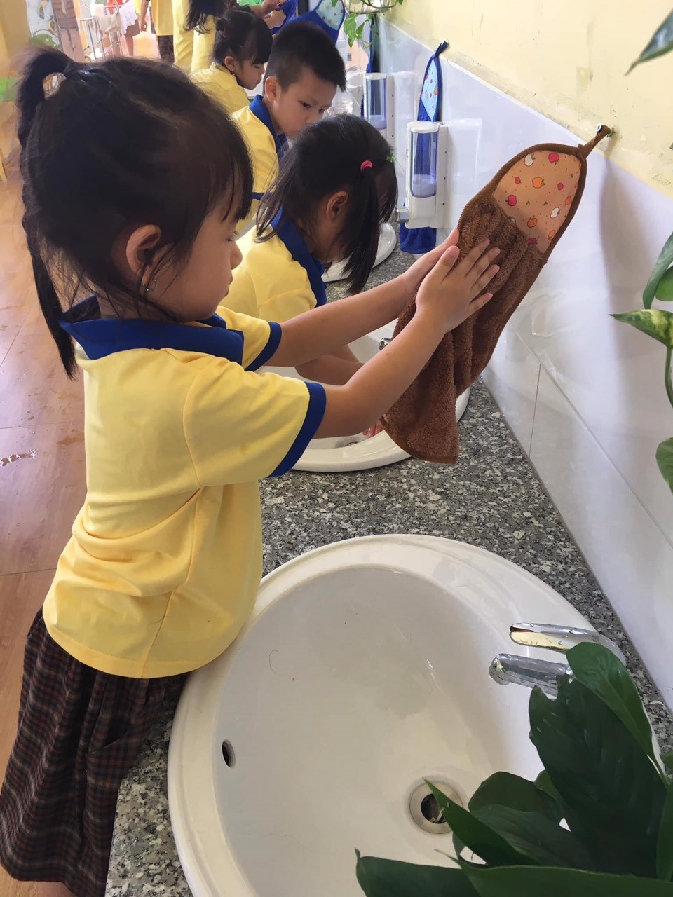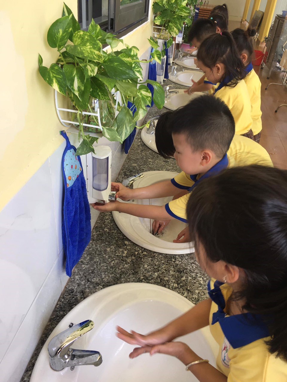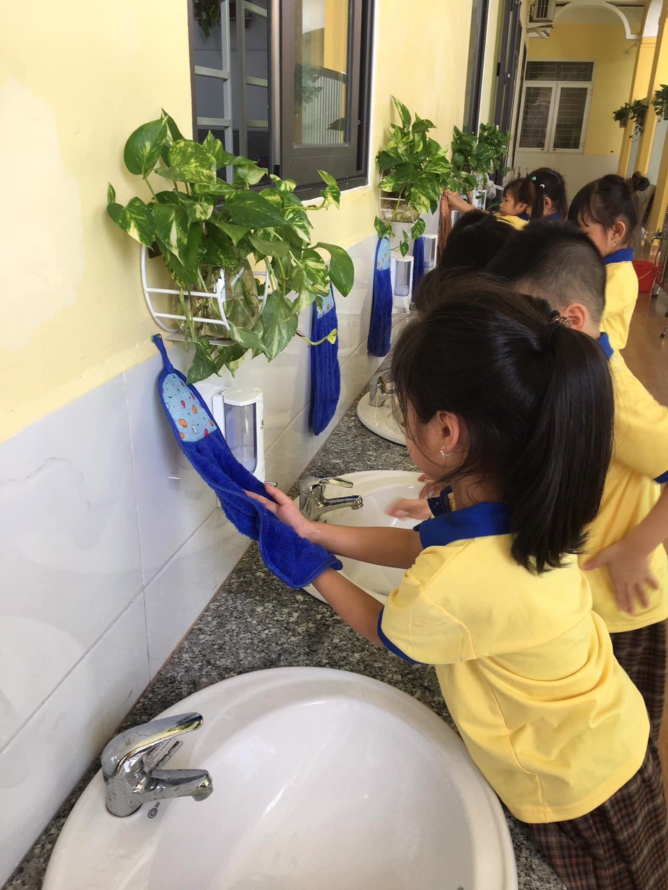 Còn rửa tay các bé phải rửa đúng theo các bước , lấy lượng xà phòng vừa đủ, biết vặn và tắt vòi nước khi k dùng. Biết lau tay vào khăn sau khi rửa tay.