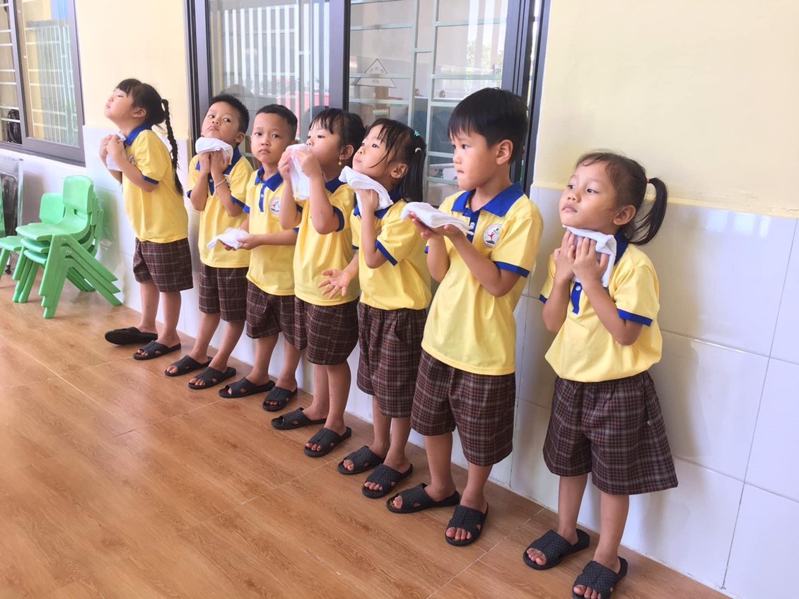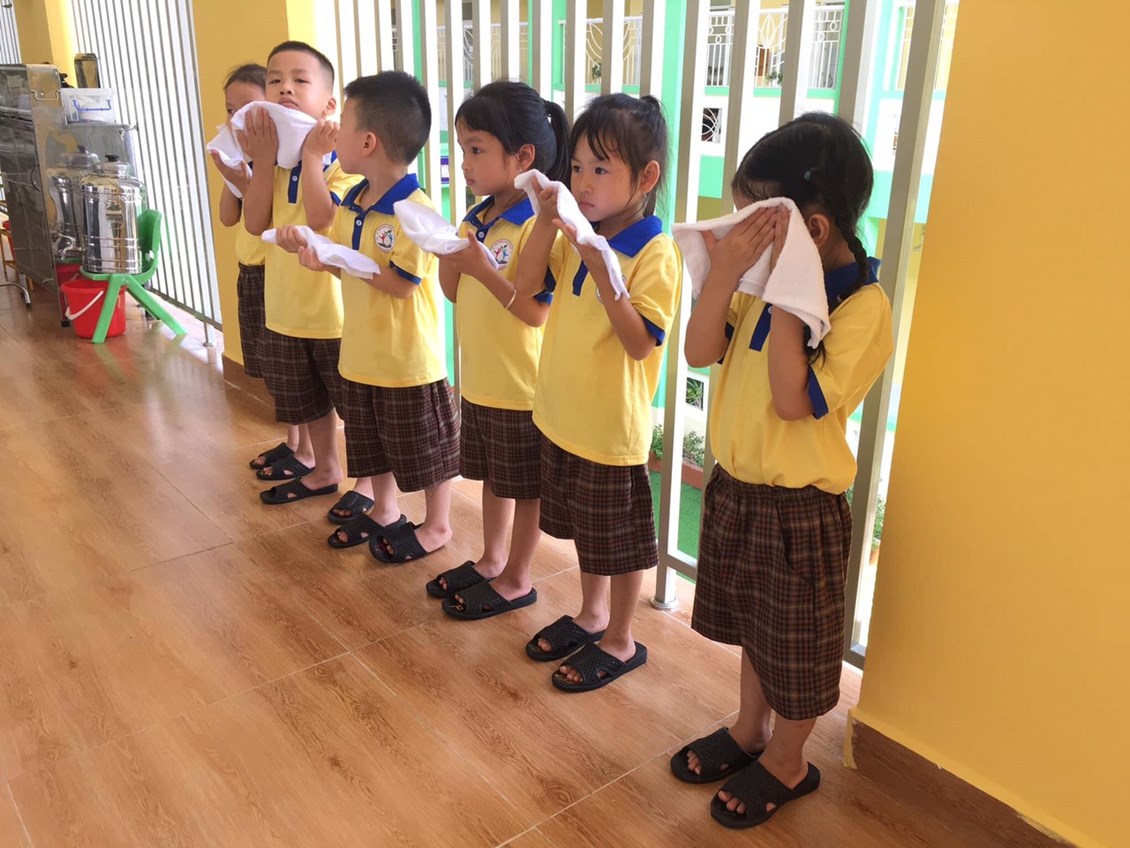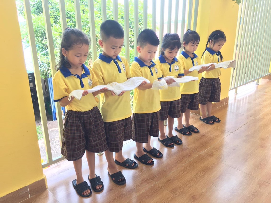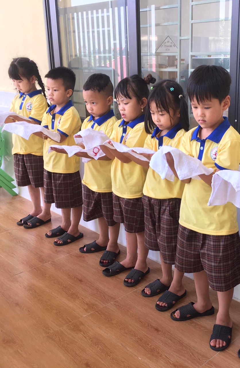 Còn rửa tay các bé phải rửa đúng theo các bước , lấy lượng xà phòng vừa đủ, biết vặn và tắt vòi nước khi k dùng. Biết lau tay vào khăn sau khi rửa tay.