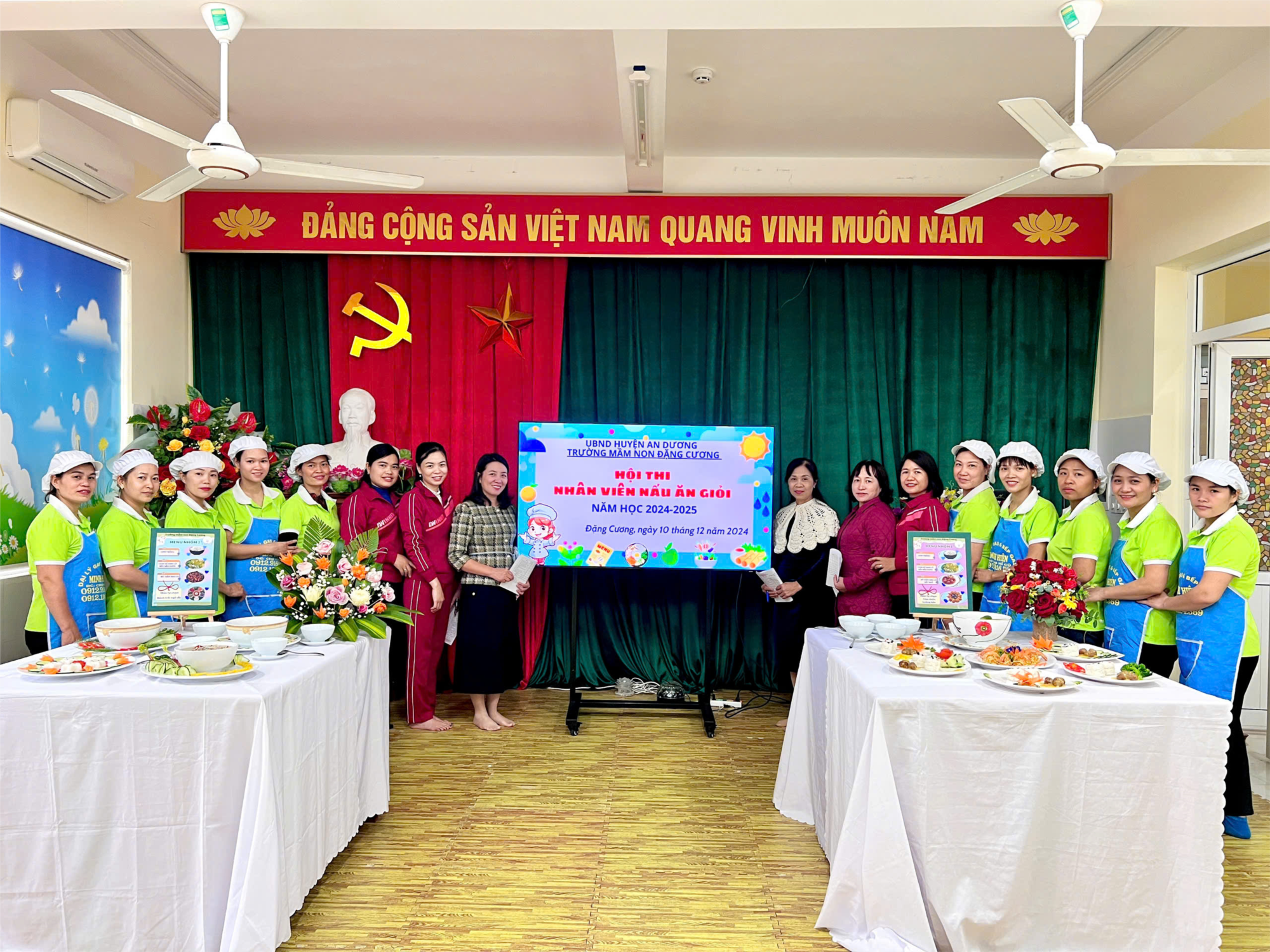Chăm sóc, nuôi dưỡng trẻ đóng vai trò vô cùng quan trọng và không thể thiếu được trong các trường mầm non đặc biệt là dinh dưỡng. Với mục đích tạo điều kiện để cô nuôi thể hiện năng lực tay nghề, học tập, trao đổi kinh nghiệm, sáng tạo chế biến món ăn, phối hợp thực phẩm đảm bảo dinh dưỡng và lượng Kalo cần thiết cho trẻ mầm non; Tìm ra được cách chế biến món ăn ngon được trẻ yêu thích góp phần làm phong phú ngân hàng thực đơn cho trẻ mầm non, đáp ứng yêu cầu chăm sóc nuôi dưỡng trẻ, giúp trẻ ăn ngon miệng ăn hết suất ăn, cơ thể phát triển hài hòa toàn diện về thể chất và tinh thần. Chiều ngày 10/12/2024 Trường Mầm non Đặng Cương đã tổ chức hội thi “Nhân viên nấu ăn giỏi” cấp trường năm học 2024-2025 đã được 100% nhân viên tham gia nhiệt tình, sôi nổi. Tổ nuôi được chia thành 2 nhóm, mỗi nhóm nấu 10 suất ăn cho trẻ theo thực đơn. Sau đây là 1 số hình ảnh đặc sắc của Hội thi.