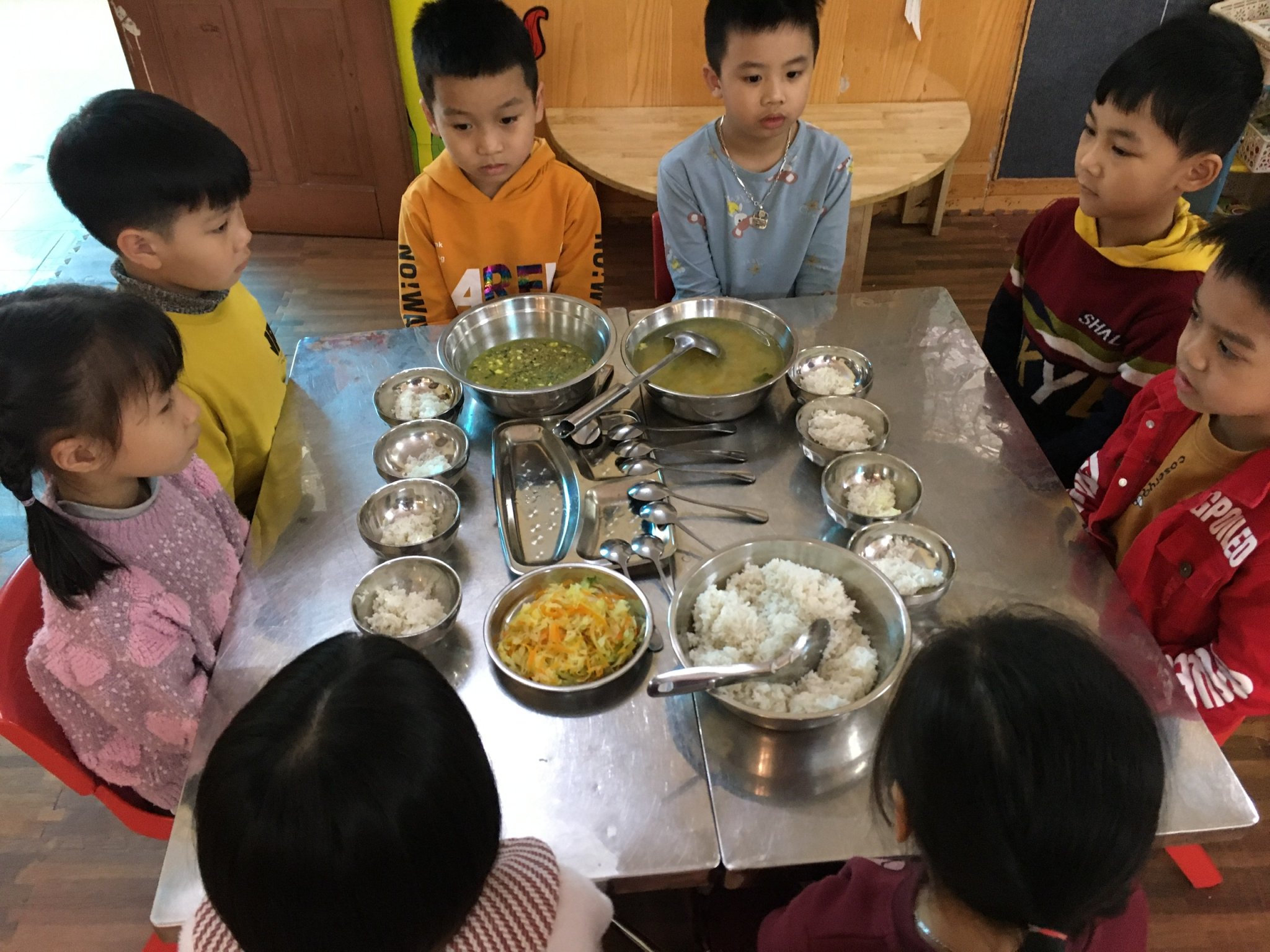 nhà bếp tôi luôn quan sát xem thức ăn đã đủ với số trẻ hay chưa, thức ăn chín